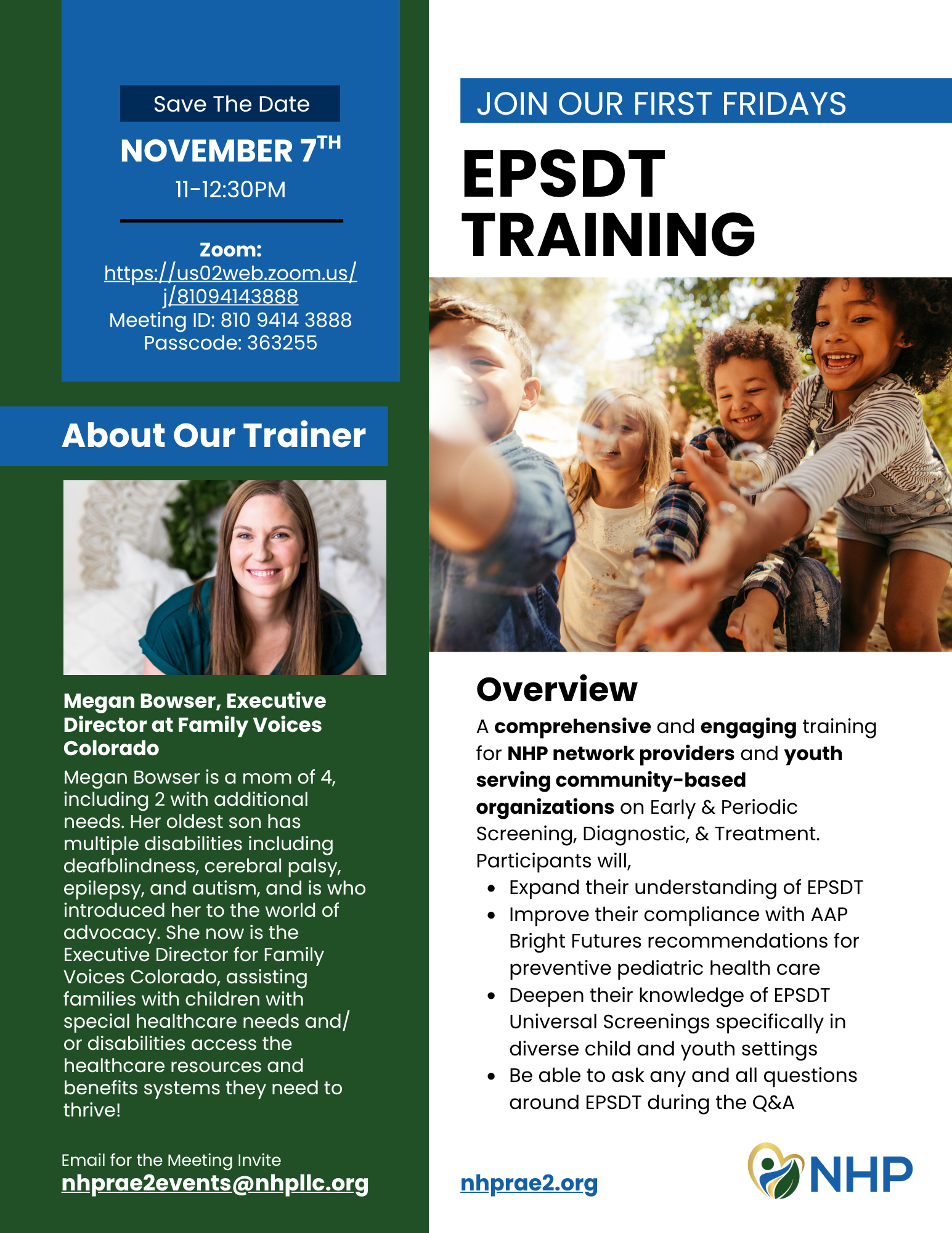 Join us for a comprehensive and engaging training by Family Voices for NHP network providers and youth serving community-based organizations on Early & Periodic Screening, Diagnostic, & Treatment. See more information on the flyer: NHP First Fridays Flyer- EPSDT 11.7.25.